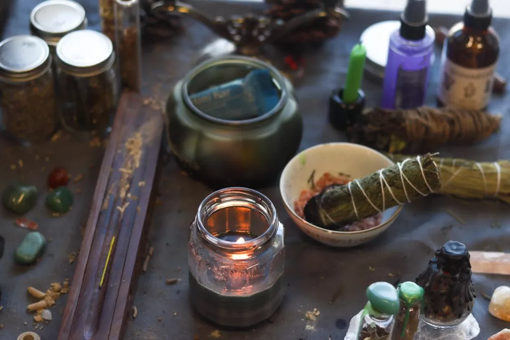 Featured image: A lit candle on the community alter in the Storm Witch shop on Jan. 25, 2022. Photo by Jami Hitchcock.