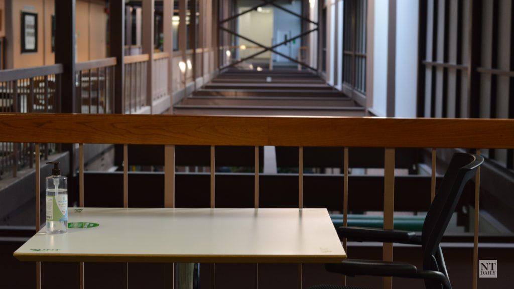Featured Image: A table with hand sanitizer sits at the nearly empty Discovery Park campus on Feb. 24, 2021. The College of Engineering is located at the Discovery Park campus. Image by Ricardo Vazquez Garcia