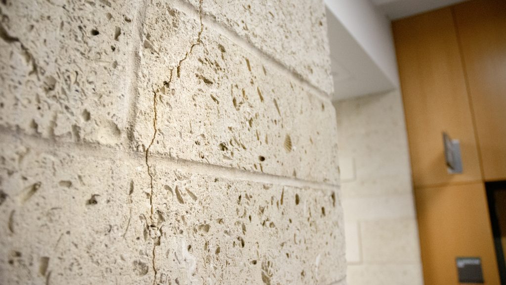 Featured Image: A crack climbs the wall of the Business Leadership Building showing evidence of potential movement in the building’s foundation. Image by Will Baldwin