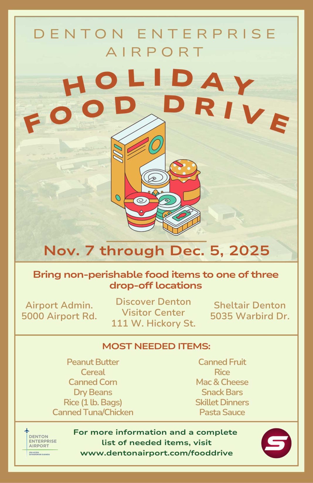 This holiday season, Denton Enterprise Airport and Sheltair Aviation are organizing a food drive to aid local families experiencing food insecurity. The airport community is encouraged to contribute to this effort.