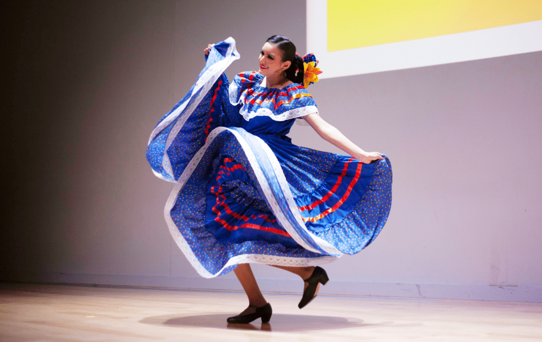 Dressed in vibrant colored dresses with ribbon woven through the fabric, the first group of dancers take the stage to perform “Son de la Negra,” a song and dance representing the Mexican region of Jalisco.