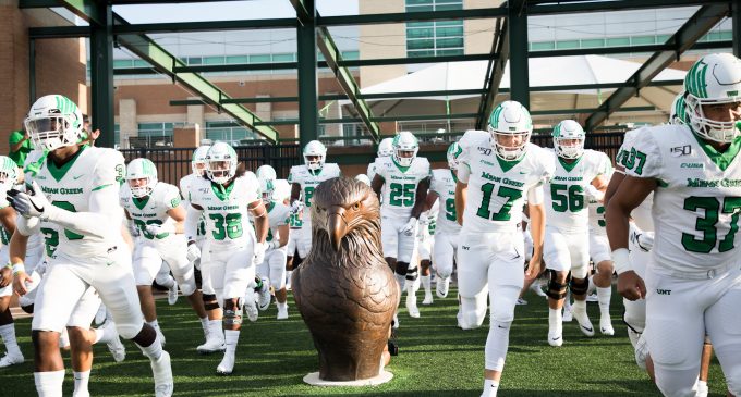 Featured Image: The Mean Green run onto the field before the game against Abilene Christian at Apogee Stadium on Aug. 31, 2019. Image by Jordan Collard