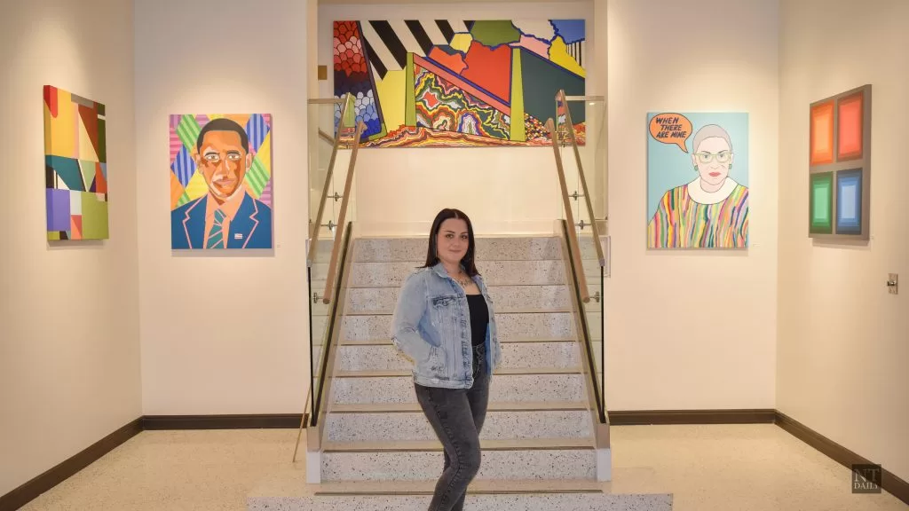 Featured Image: Artist Lauren Muñoz poses in the TWU student union between four of her paintings on display on Nov. 15, 2020. Image by John Anderson