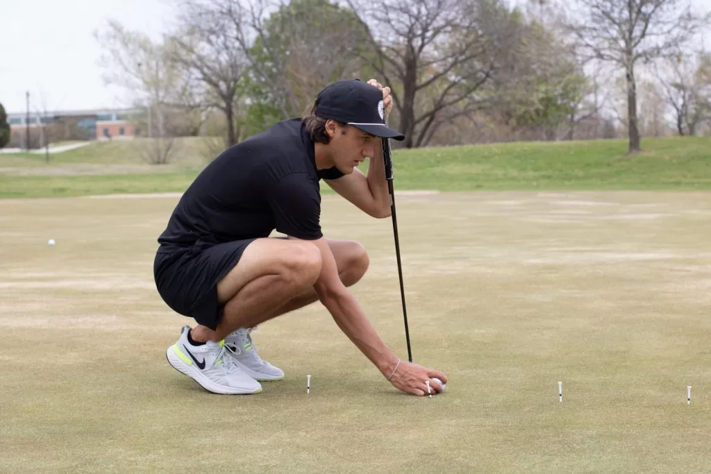 Featured Image: Vincente Marzilio reads the putting green on April 4. 2022. Photo by Maria Crane