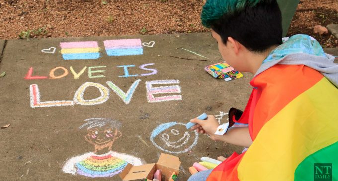 Featured Image: Love is Love chalk art drawn by Ryan McLendon, he/him on June 12, 2021. Image by Laura Nunez