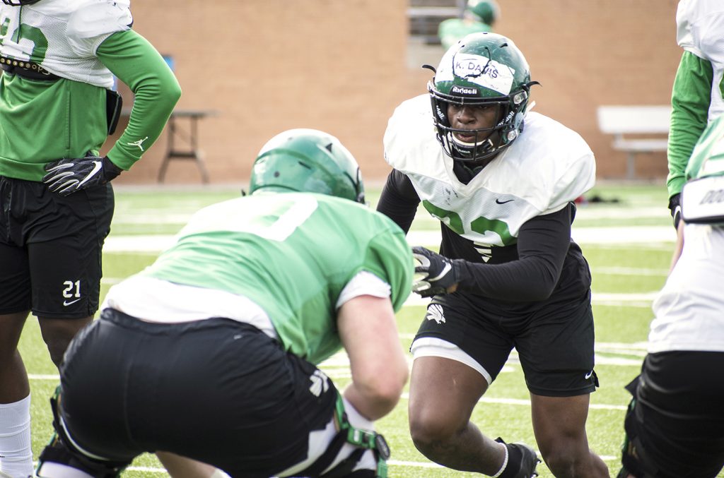 Featured Image: Mean Green sophomore linebacker KD Davis goes up against an offensive lineman during a pass rushing drill on April 1, 2019 at Apogee Stadium. Image by: Trevon McWilliams.