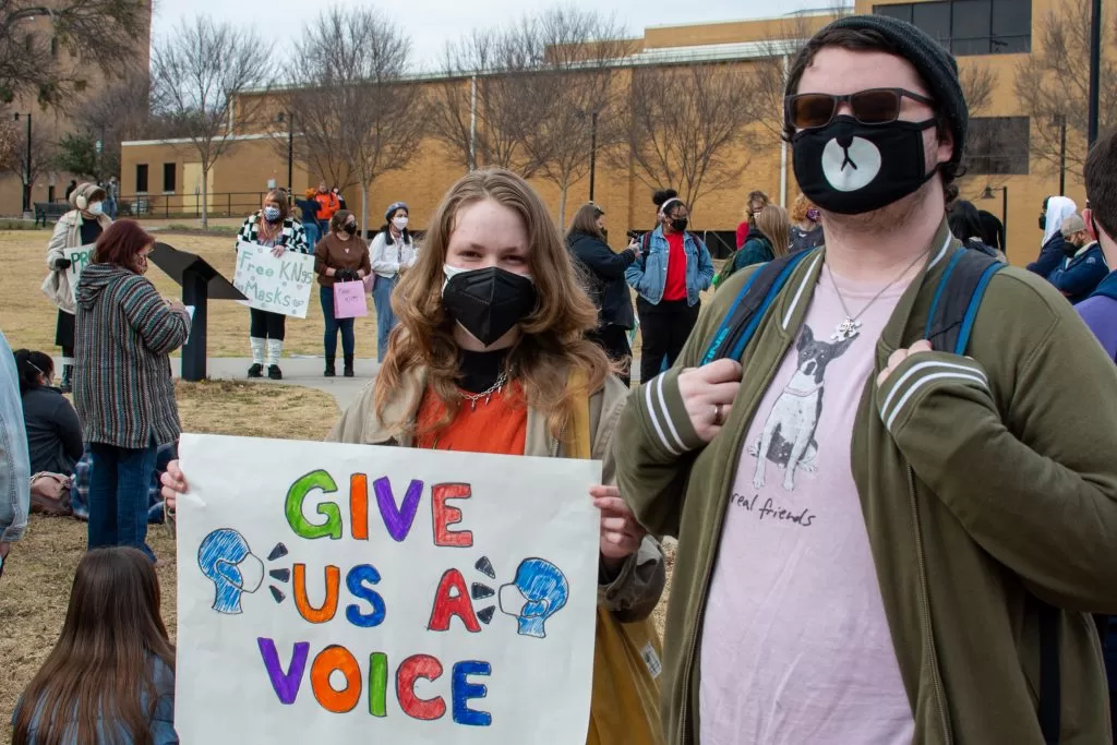 As the crowd opened the floor to speakers, attendees voiced concerns about the lack of social distancing policies in classrooms and the stress they felt having to take in-person classes. Multiple speakers cited fears of getting friends and family sick, some of whom are immunocompromised. Others expressed concerns about the omicron variant, which has been identified as a large driver of recent increased infections and hospitalizations in the Dallas-Fort Worth area by a University of Texas Southwestern Medical Center report.
