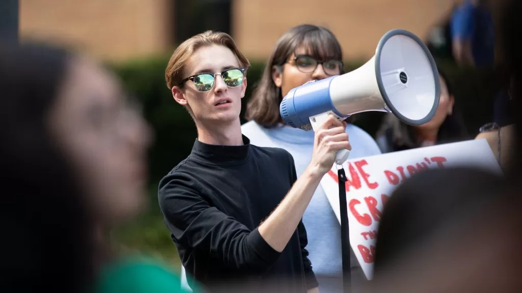 A student adresses the crowd druning the protest against ICE at the Libray Mall on Oct. 9, 2019. Image by Ricardo Vazquez Garcia
