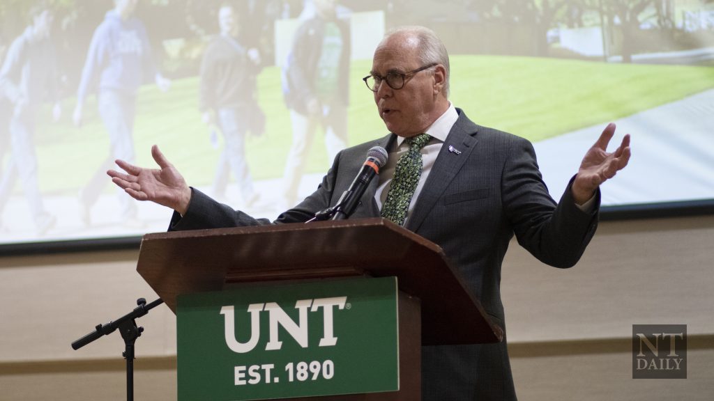 Featured Image: Addressing the audience of students and faculty, UNT President Neal Smatresk begins the State of the Student Body Address. Image by Grace Davis