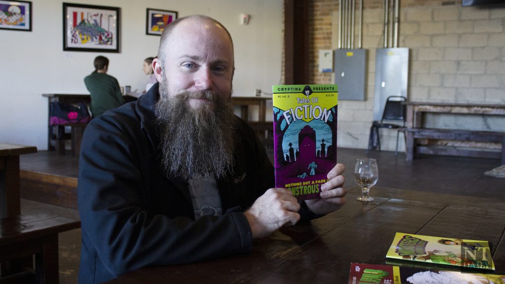 Featured Image: Denton resident Bryan Kelly poses with his comic book “Tales of Fiction” on Feb. 27, 2020. Kelly ws a self-published comic book artist and author. Image by Scout Streit